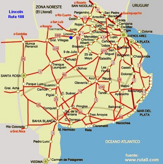 Desde La Plata: Son 400 kilómetros, por Ruta 6 hasta Luján y desde allí por Ruta Nacional 7 hasta empalmar con Ruta Nacional 188 hasta Lincoln.